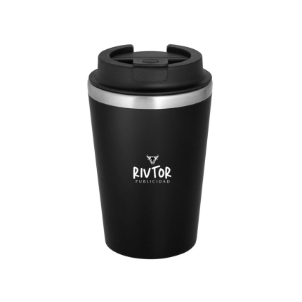 Mug doble pared, sellado al vacío. Mug con aislamiento térmico. Tecnología vacuum. Interior en acero 304 reciclado y exterior en acero 201. Tapa de poliestireno con anillo de silicona. Pintura acabado semi mate. Parte inferior texturada para un mejor agarre. Base antideslizante. Mantiene hasta 8 hs la temperatura de las bebidas calientes y hasta 12 hs la de las bebidas frías.