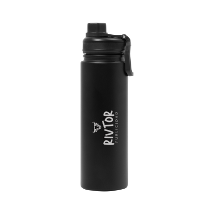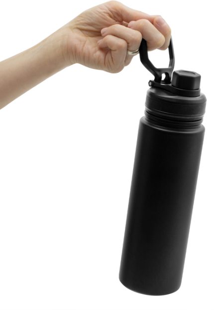 Botella doble pared, sellada al vacío. Interior en acero 304 y exterior en acero 201. Tapa con anillo de silicona, boquilla con cierre a rosca antiderrame y manija plástica para su agarre. Mantiene hasta 12 hs la temperatura de las bebidas calientes y 24 hs de las bebidas frías.