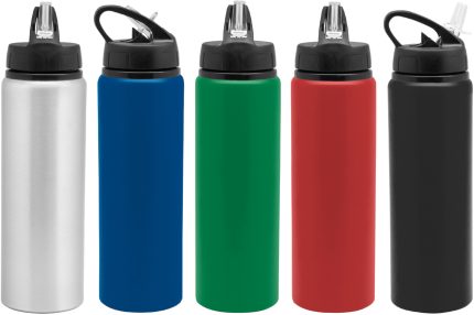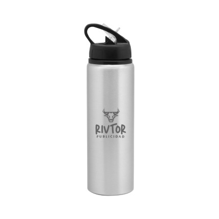 Botella de aluminio con manija de agarre en la tapa, sorbete plástico y boquilla rebatible. Tapa a rosca de plástico.