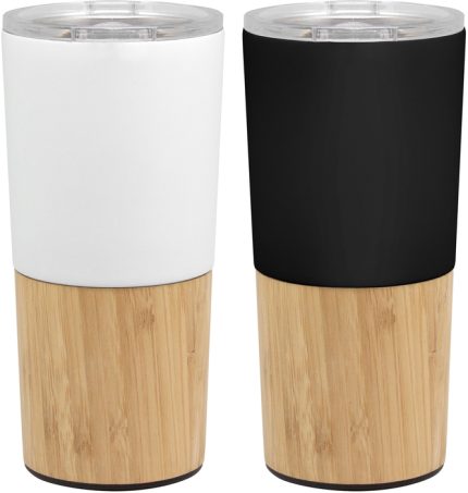 Mug doble pared, sellado al vacío. Interior en acero 304 / exterior en acero 201, con detalles de Bambú. Tapa plástica transparente a presión con anillo de silicona. Mantiene hasta 8 hs la temperatura de las bebidas calientes y hasta 12 hs la de las bebidas frías.