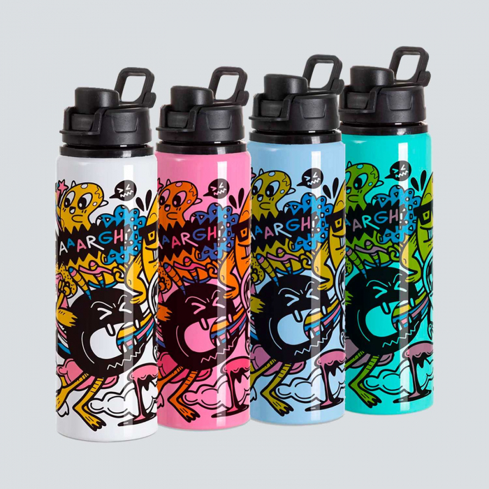 Botella de aluminio con manija de agarre en la tapa, sorbete plástico y boquilla rebatible. Tapa a rosca de plástico.