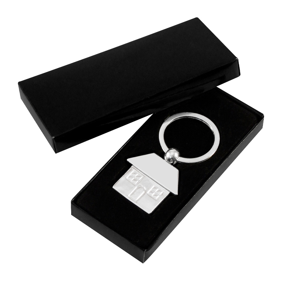 Llavero Metálico Casa, con reverso liso. Presentación en estuche laminado negro con cuna aterciopelada.